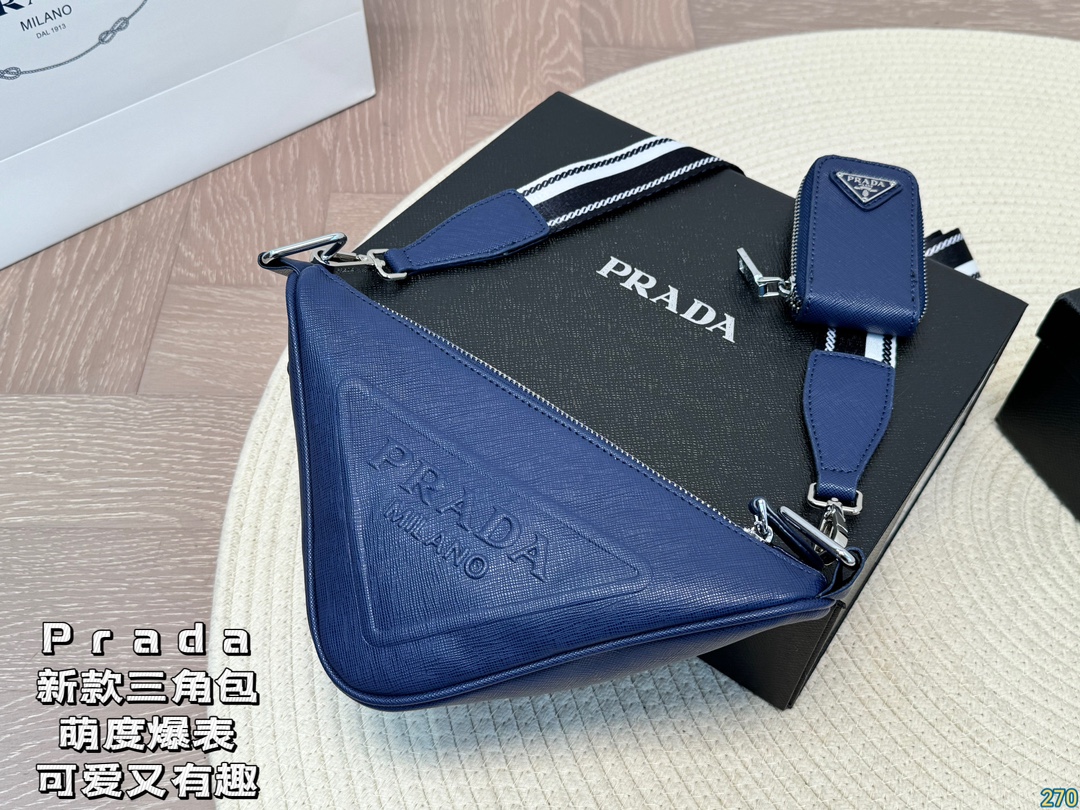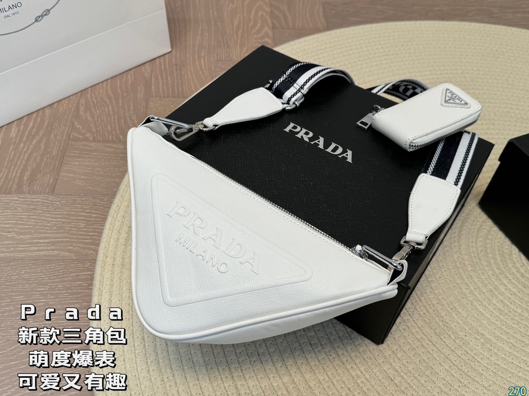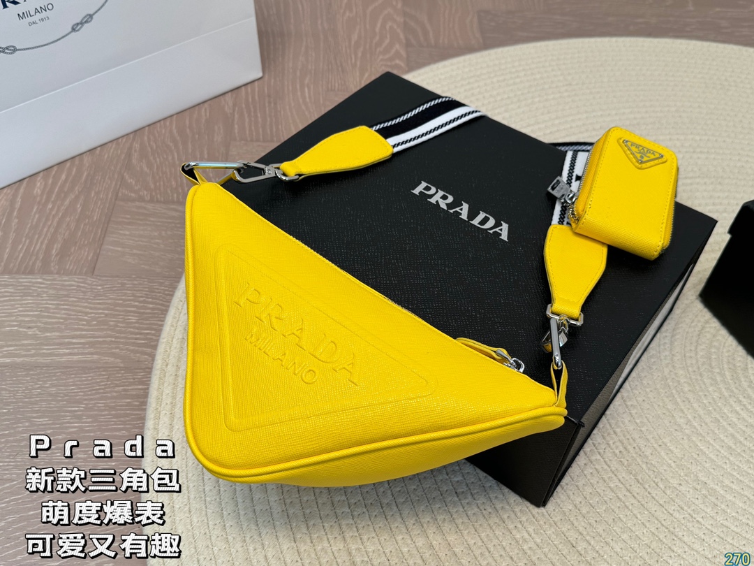Prada triangle bag The most protagonist bag in this series, I think it is the new small triangle bag that is so cute. This time not only the logo, but also the shape of the handbag is triangular. Such a simple and unique design is very Prada style. It has both good looks and creativity. It can be layered with the bags you often carry when going out on the street. It looks good and is interesting. Size: 26 14